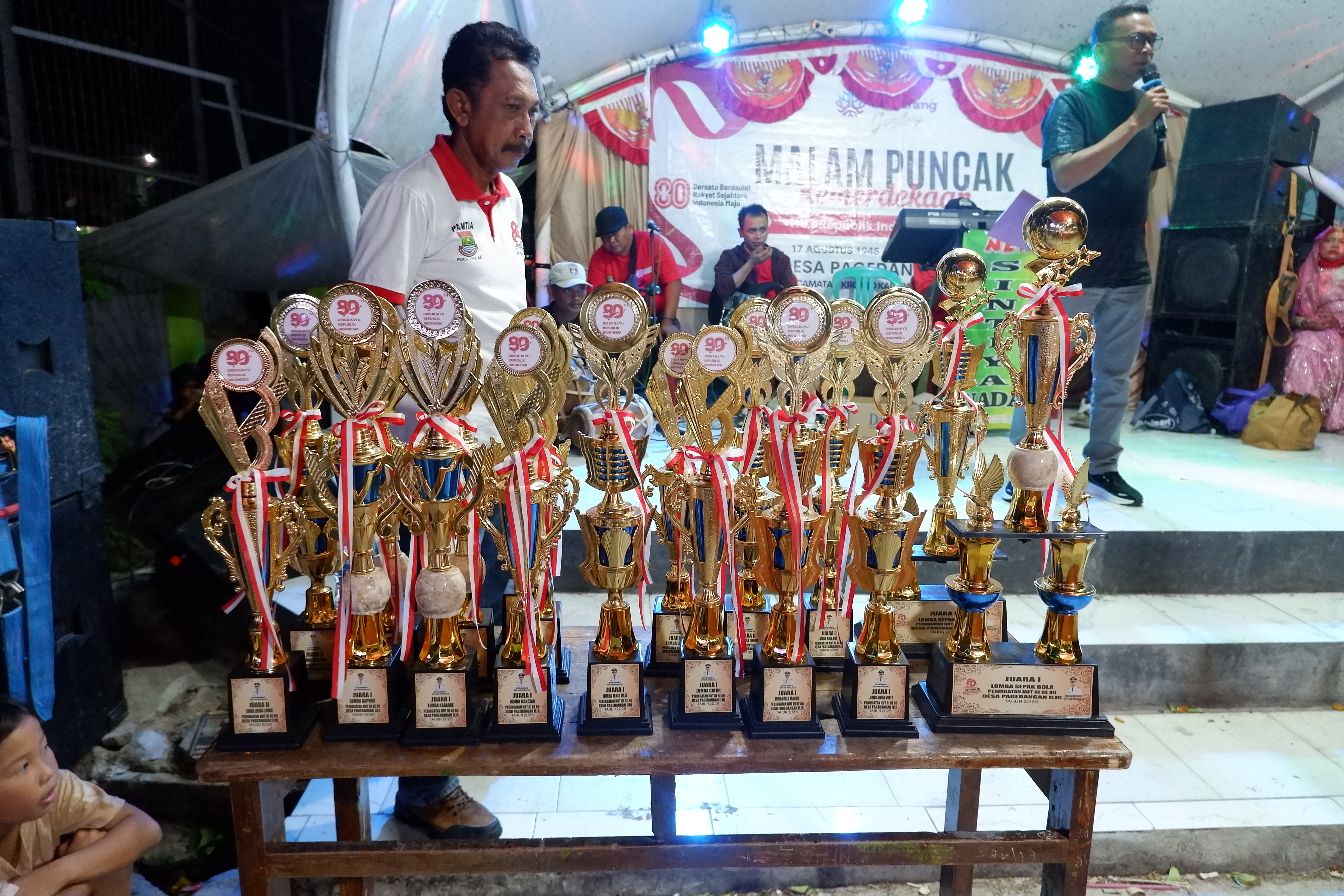 Pagedangan Ilir, 18 Agustus 2025,- setelah melaksanakan Upacara Pengibaran Bendera HUT Ke 80 RI, panitia PHBN Desa Pagedangan Ilir langsung menggelar malam puncak resepsi masih dalam rangka memeriahkan HUT Kemerdekaan RI ke 80 masih pada tanggal 17 Agustus 2025 malam, acara diisi dengan pengumuman pemenang lomba/pertandingan cabang olahraga yang telah dilaksanan untuk memeriahkan HUT RI Ke 80.
